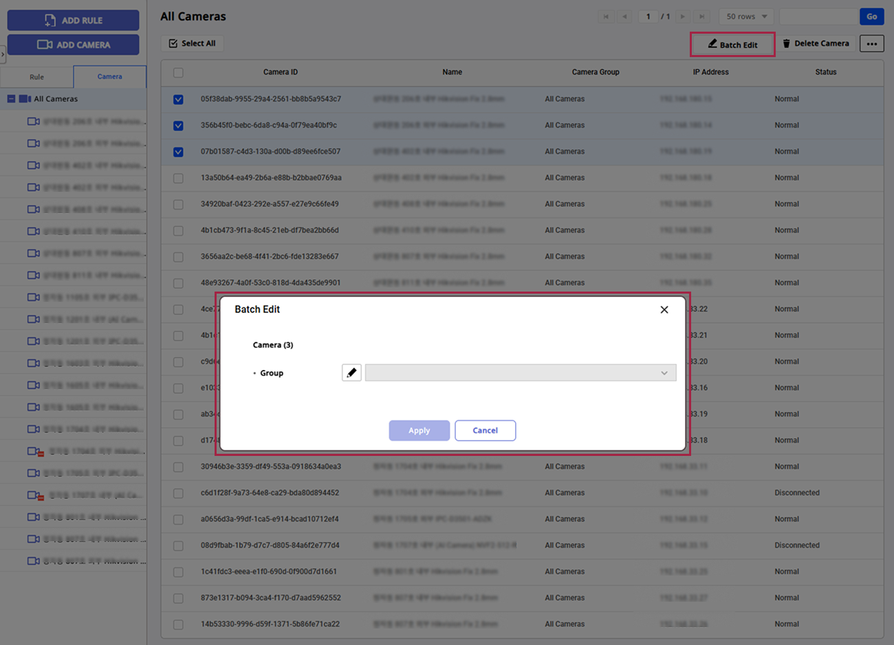 If you select more than one camera, the Batch Edit button will be activated in the upper right corner of the screen. Click the Batch Edit button.