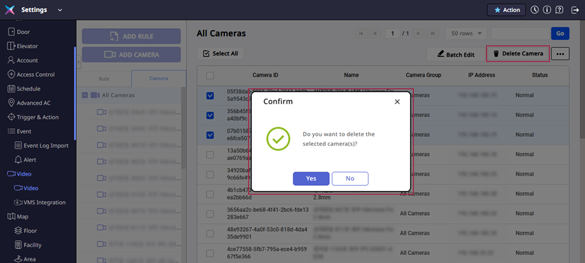 If the camera you want to delete is included in a rule, you cannot delete the camera. Remove the camera from the rule and try again. For more information on rule creation and management, refer to the following.