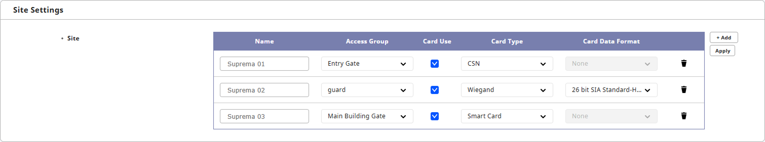 You can set the access group to use in the visiting PC and managing PC of each site. You can also set whether or not to use cards. If you are using a card, you can also set Card Type and Card Data Format.