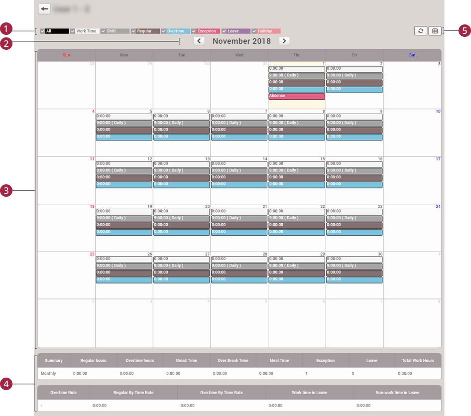 Attendance record summary: Shows the monthly attendance record.