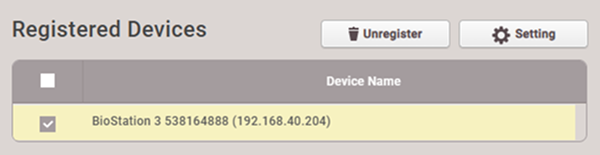 To edit the attendance settings of a registered device, click Setting. For more information on attendance settings, refer to the following link.