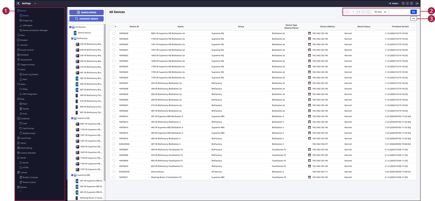 On the Settings page, manage various settings of BioStar X. The UI components of this page are as follows: