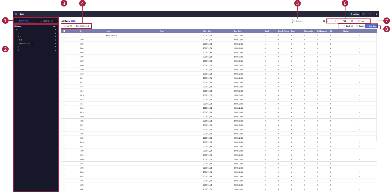 The User page's User menu allows efficient user management through various features such as managing user groups, managing users, and checking users by access rights, enhancing security through permissions. The UI components of the User page are as follows: