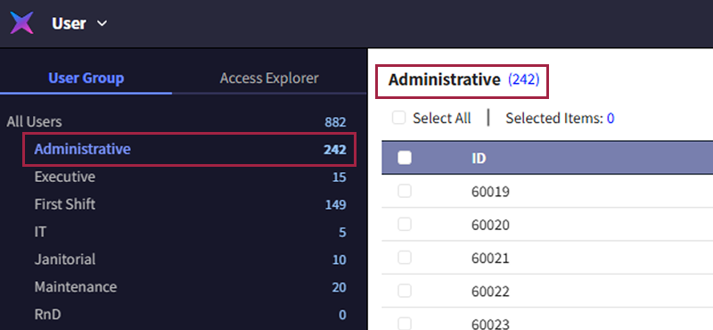 You can see users belonging to the user group. In the User page, select the desired user group from the left sidebar. Users from the selected user group will be displayed in the list.