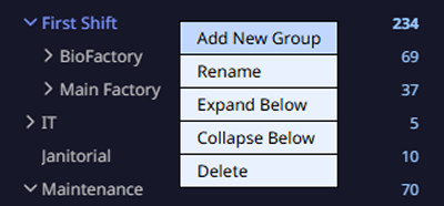 If there are subgroups within the group, you can expand or collapse them. Select the parent group and right-click. In the popup menu, click Expand Below or Collapse Below.