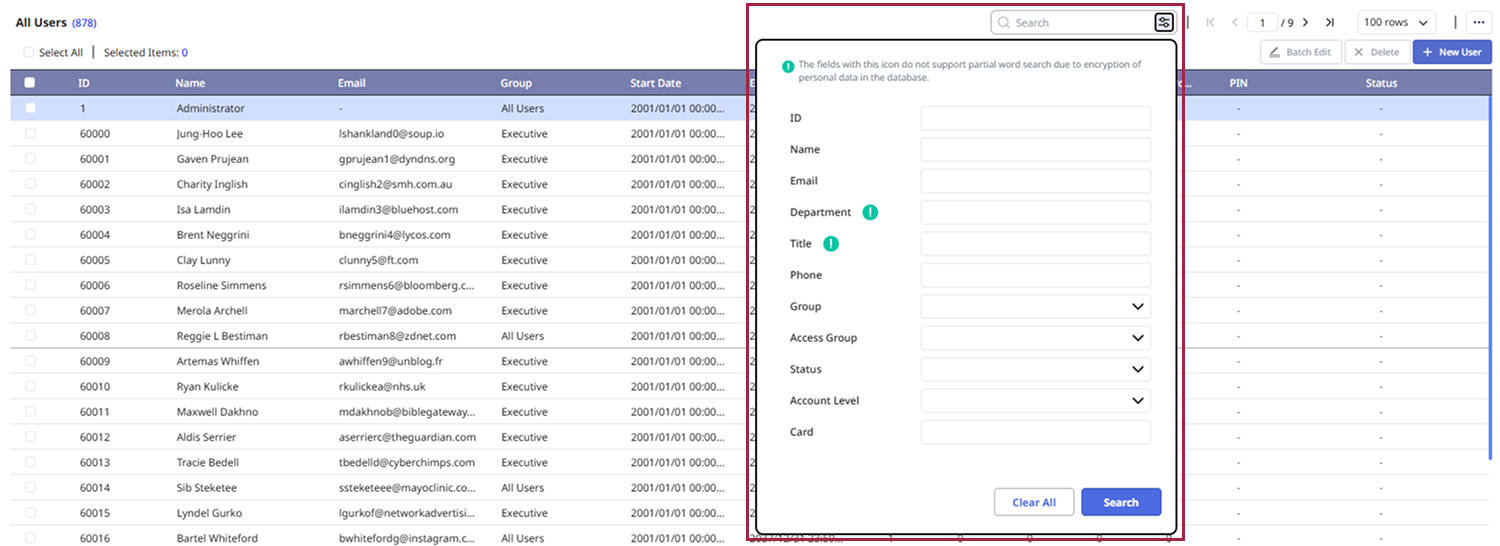 You can search based on the user's ID, name, or email. Enter the desired keywords in the search input field at the top of the screen and press the Enter. Users matching the specified keyword will be displayed in the list. You can check the number of search results at the very top of the list.