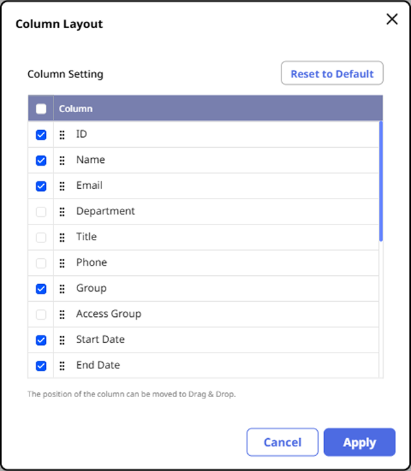 You can change the column settings displayed in the user list. Through column settings, you can select the columns to be displayed or change the order of the columns.