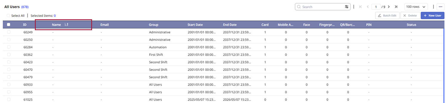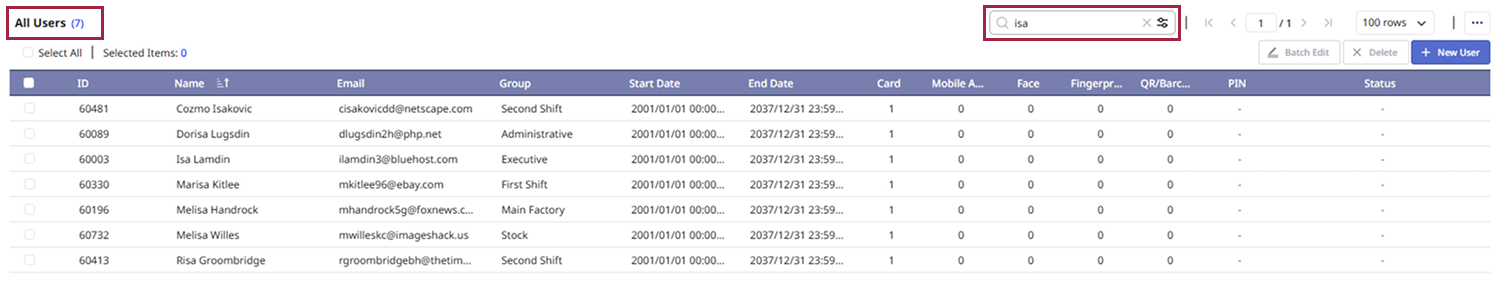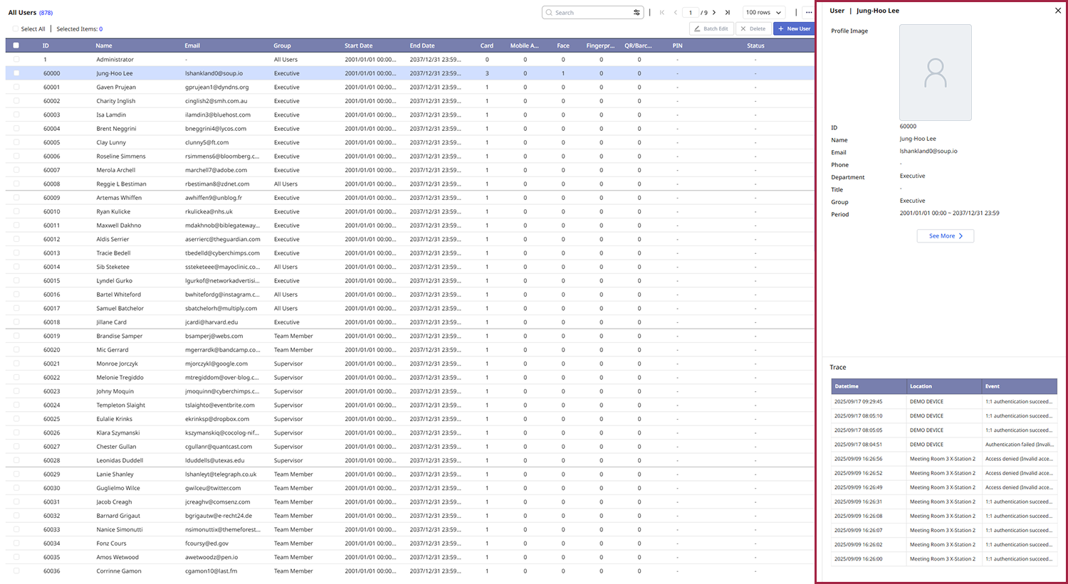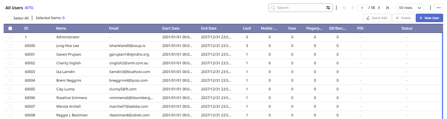The user list displays all registered users, and you can check each user's ID, name, email address, duration, status of enrolled credentials. Users are listed in order by their ID.