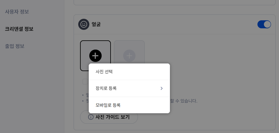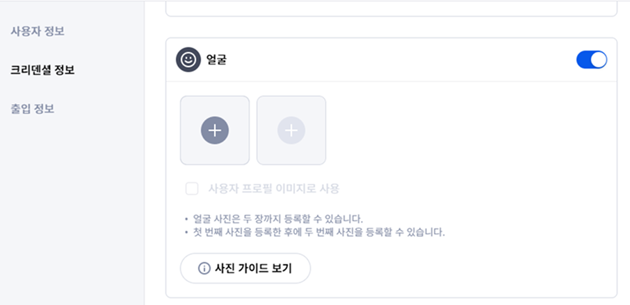 사용자 정보 창에서 크리덴셜 정보 섹션으로 이동해 얼굴 크리덴셜을 활성화하세요.