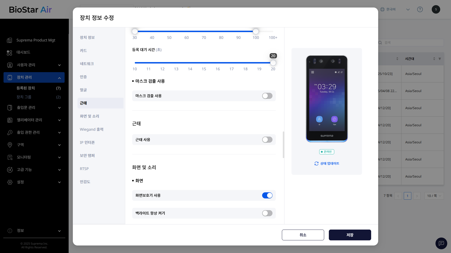 장치 정보 수정 창이 나타나면 근태 섹션으로 이동하세요.