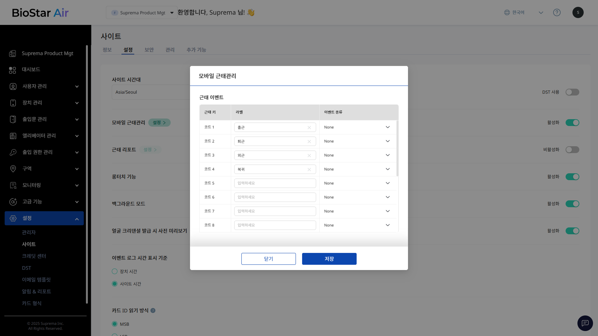 근태 이벤트 라벨은 사이트 등급에서 관리되며 장치별로 변경할 수 없습니다.