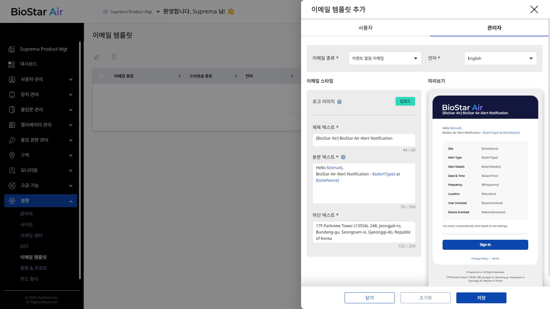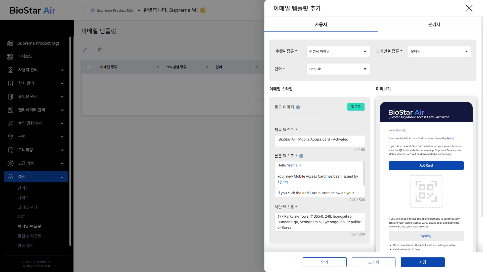 이메일 템플릿 추가 패널이 나타나면 각 항목의 설정을 구성하세요. 사용자 또는 관리자 탭을 선택하여 사용자 또는 관리자 이메일 템플릿을 설정할 수 있습니다.