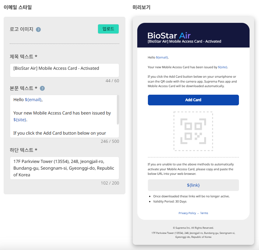 이메일의 로고와 내용을 사용자 정의할 수 있습니다. 미리보기에서 실시간으로 변경 사항을 확인할 수 있습니다.