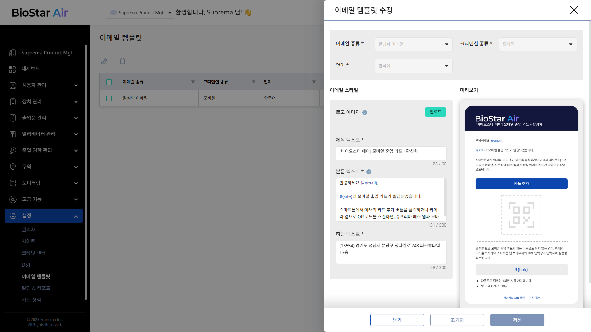 이메일 템플릿 수정 패널이 나타나면 필요한 항목을 수정하세요.