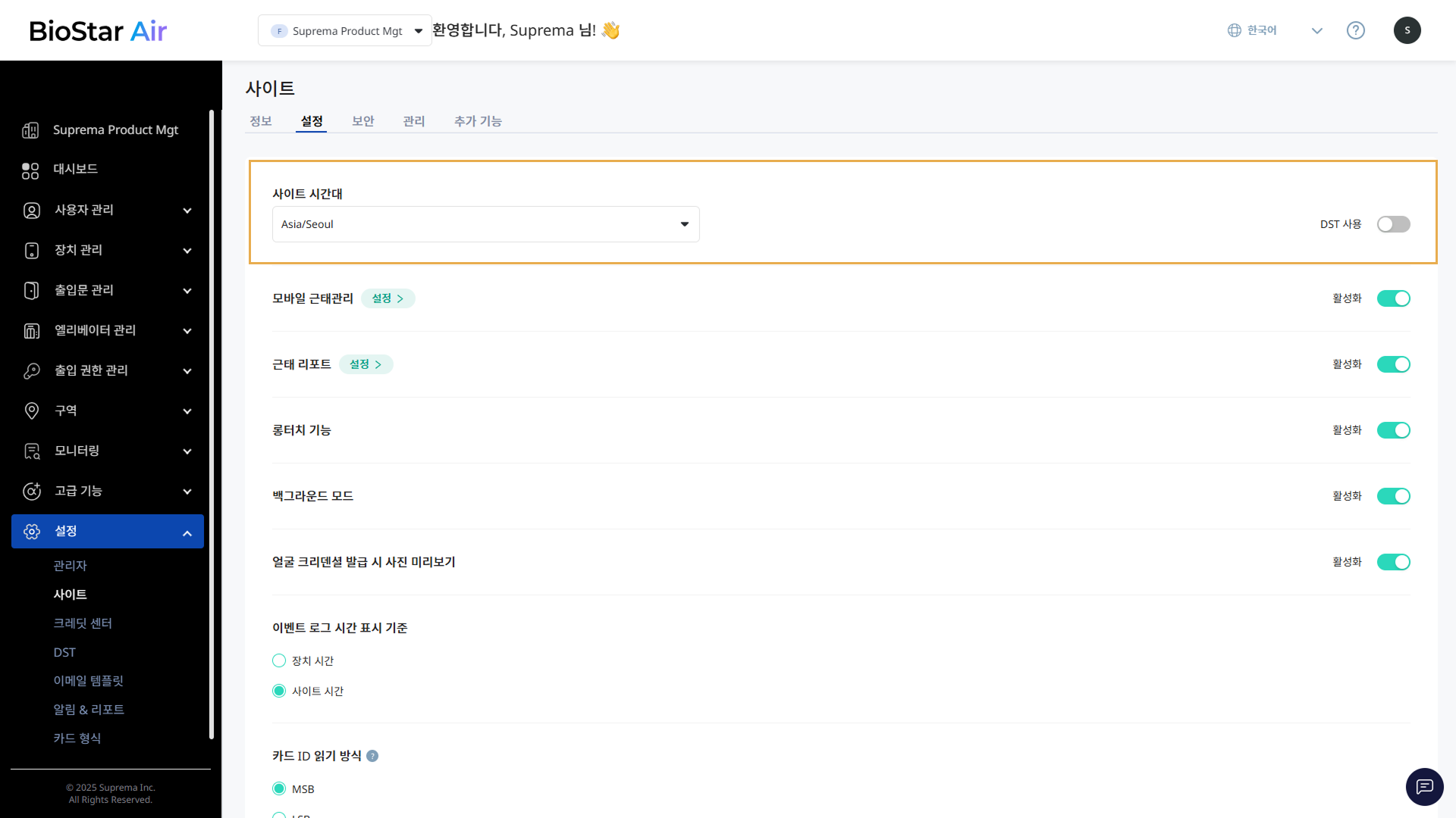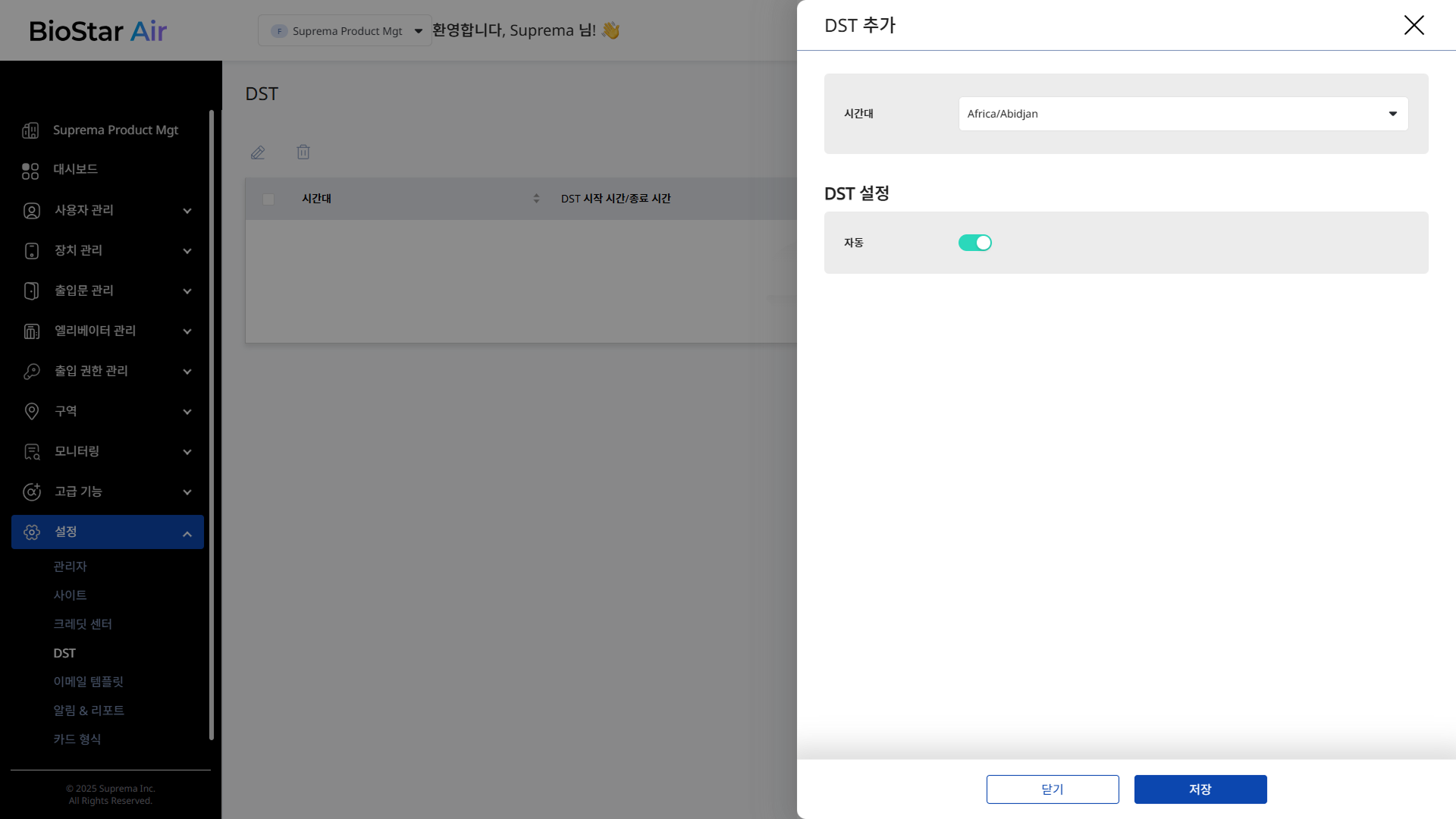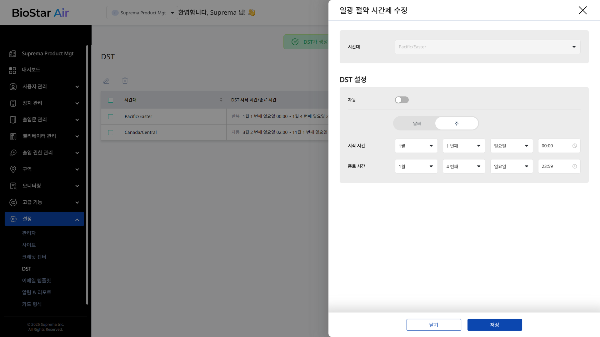BioStar Air에 연결된 각 장치는 자체 시계를 유지하며, 이를 출입 제어와 근태 기록에 사용합니다. 일광 절약 시간이 적용되는 시간대에 위치한 장치라면 반드시 DST 설정을 해야 합니다.