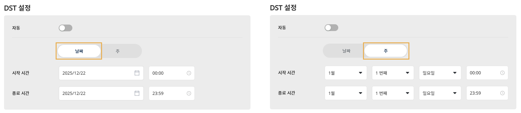 날짜: DST가 시작되고 종료되는 날짜를 선택할 수 있습니다.