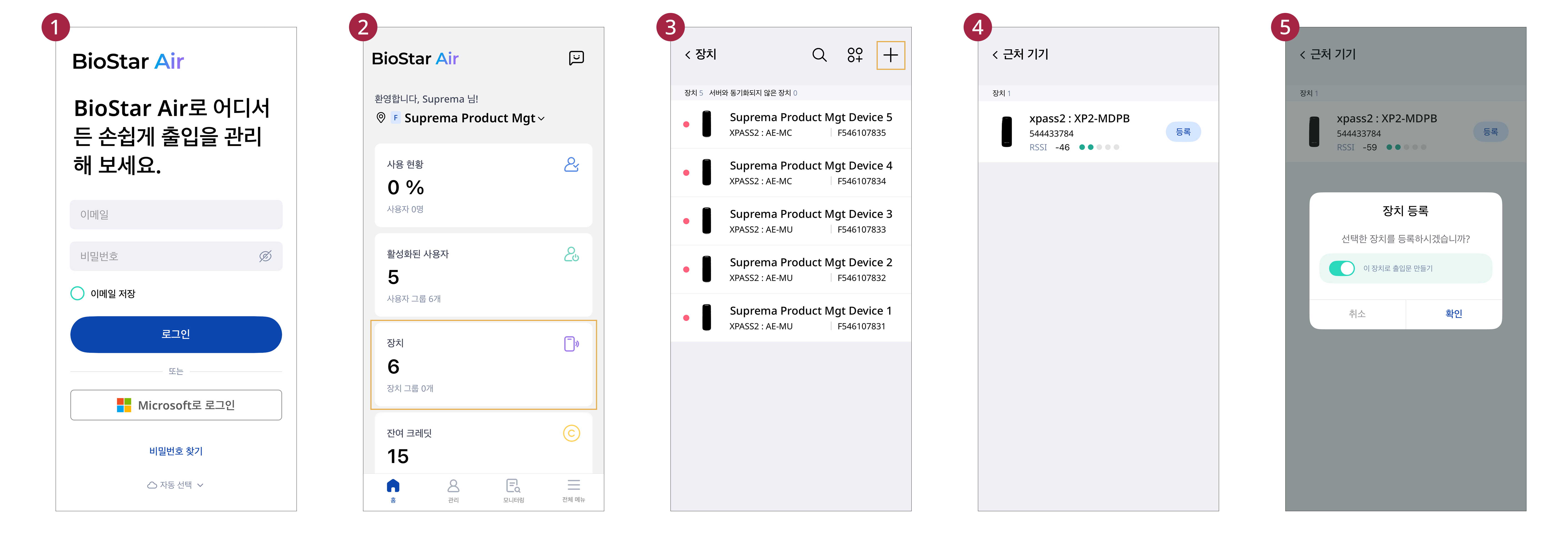 BioStar Air 모바일 앱을 사용하여 장치를 등록할 수 있습니다. 장치 등록은 Bluetooth Low Energy(BLE) 방식으로 이루어지며, 등록된 장치는 BioStar Air 포털에서 관리할 수 있습니다.