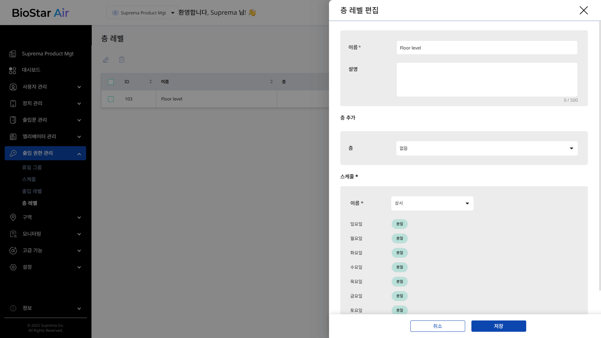 스케줄 섹션에서 층 레벨에 적용할 스케줄을 선택하세요. 제한 없는 출입을 허용하려면 상시를 선택하세요.