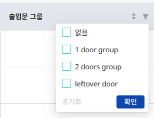 출입문 목록에서는 출입문 그룹을 기준으로 필터링하여 조회할 수 있습니다. 출입문 그룹 열의 버튼을 클릭하고 원하는 그룹을 선택하세요. 확인 버튼을 클릭하면 선택한 그룹에 속한 출입문만 표시됩니다.
