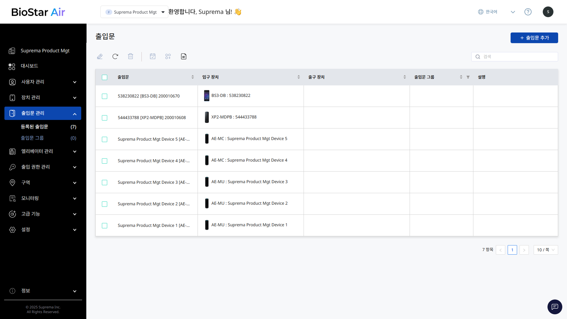 출입문 목록에서는 BioStar Air에 등록된 모든 출입문을 확인할 수 있습니다. 각 출입문의 이름, 할당된 장치, 그룹 등 주요 정보를 확인할 수 있습니다. 또한 개별 출입문을 클릭하여 세부 정보를 확인하고 설정을 수정할 수 있습니다.