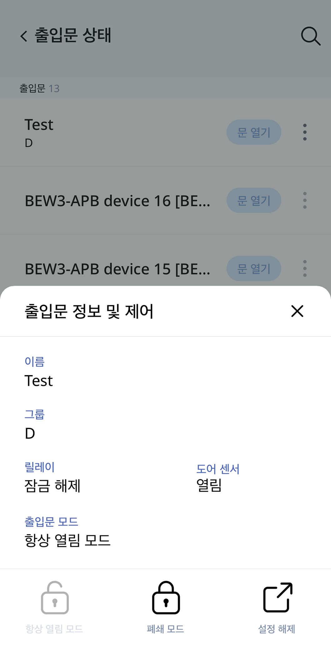 출입문 정보 및 제어 옵션이 나타나면 항상 열림 모드를 탭하세요.