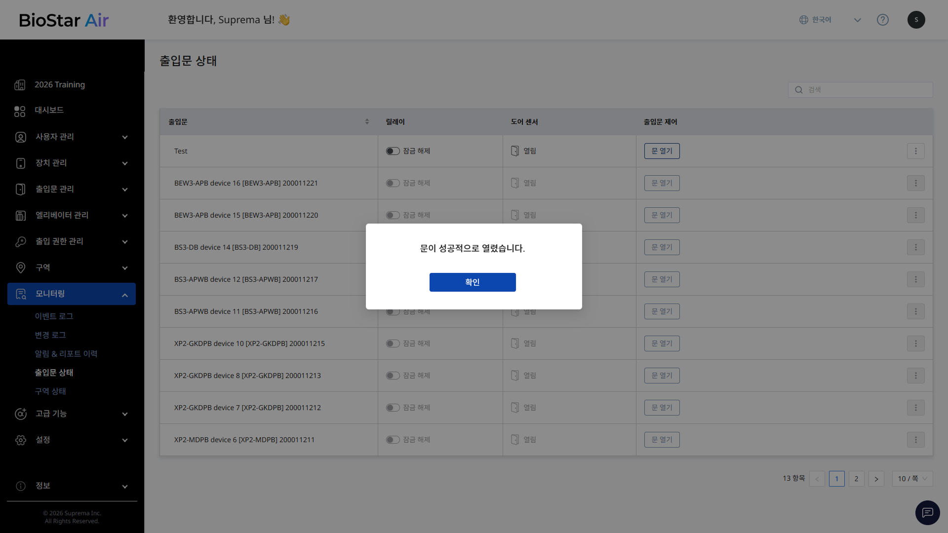 출입문 제어 열에서 문 열기 버튼을 클릭하세요.