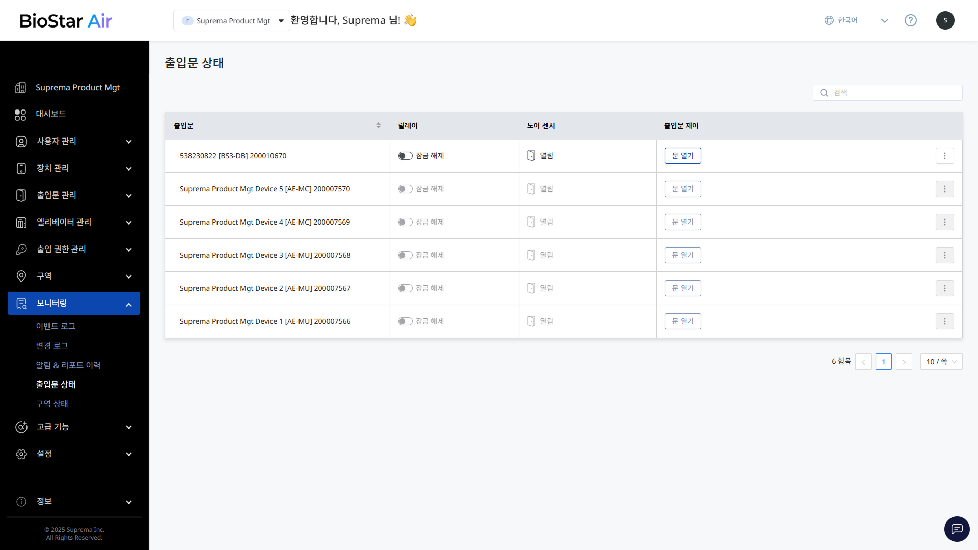 BioStar Air에 등록된 출입문의 목록을 확인할 수 있습니다.