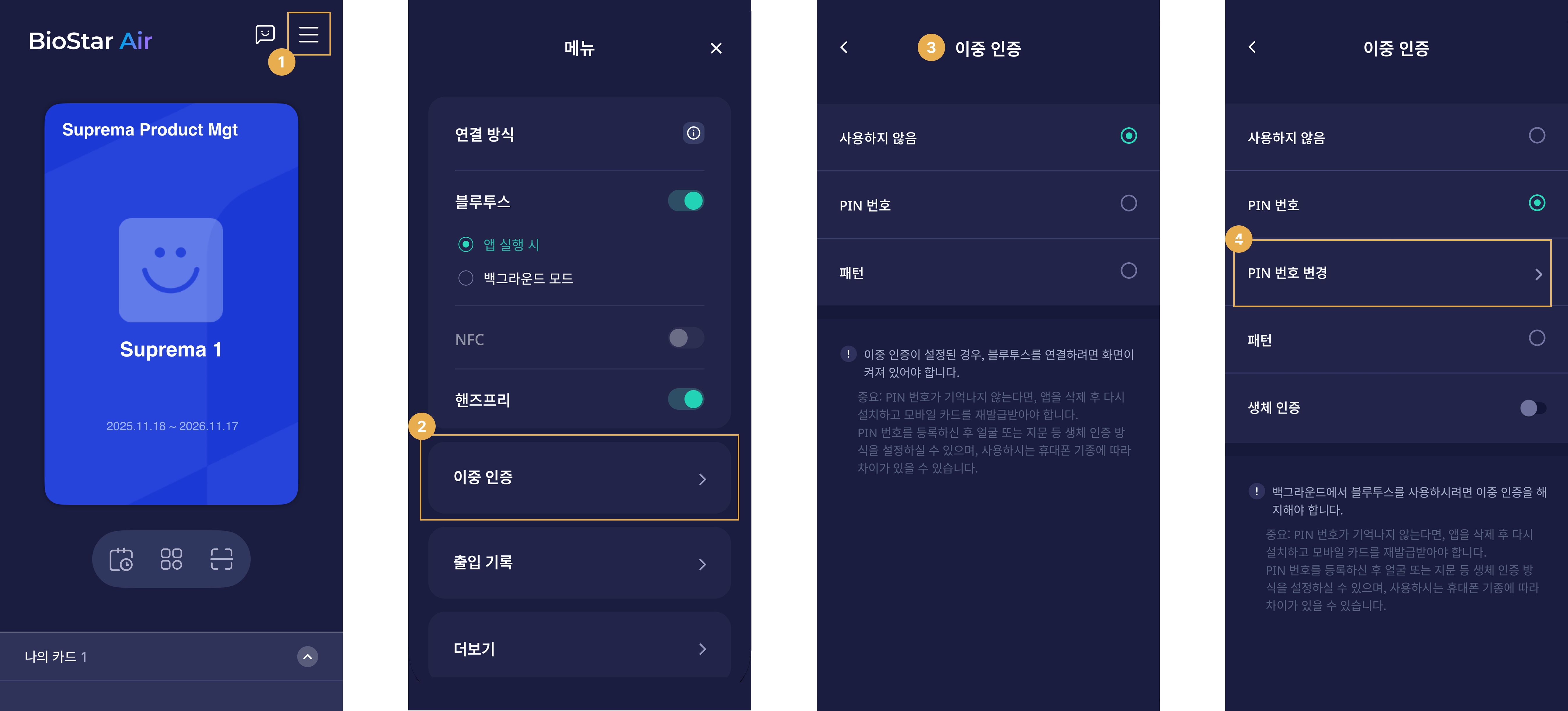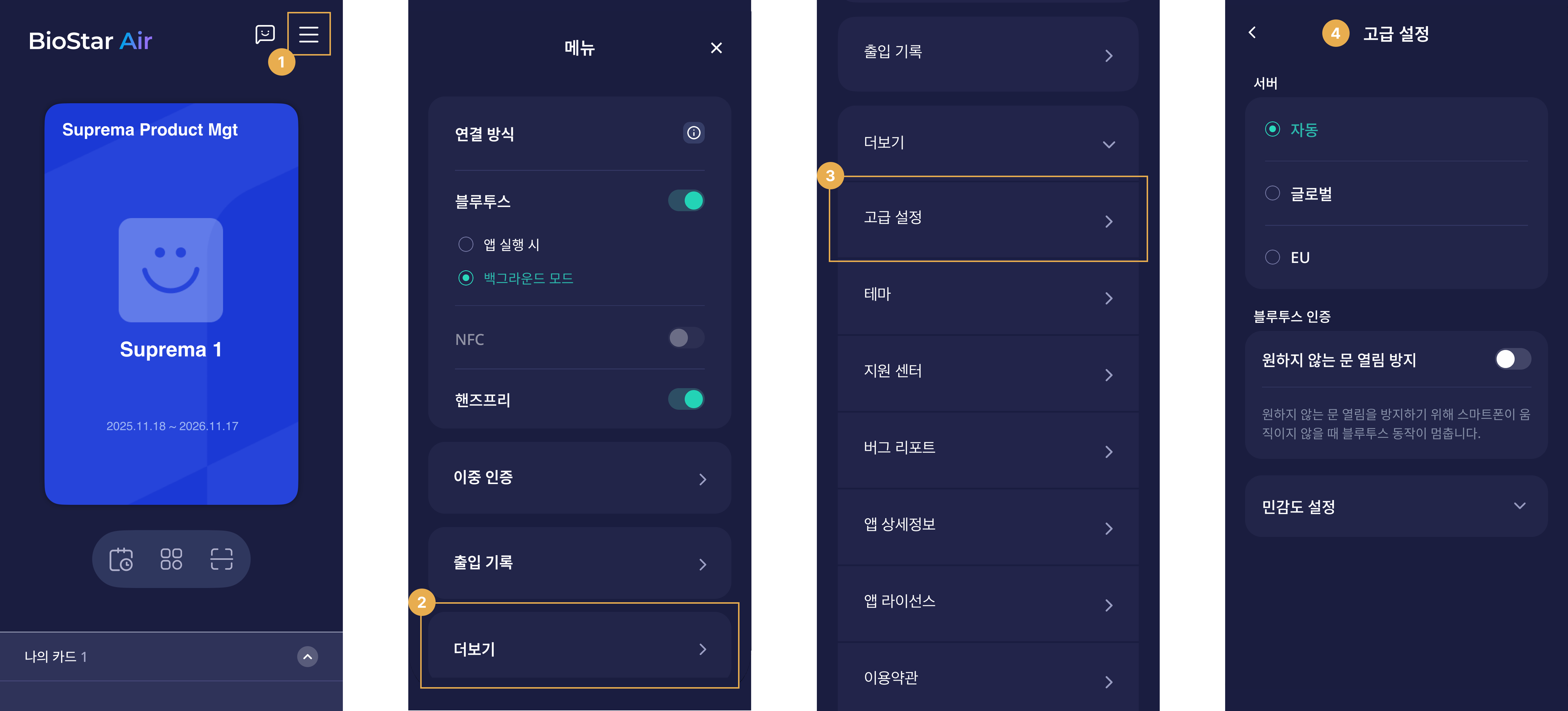 슈프리마 패스 앱 초기화면에서 오른쪽 상단의 아이콘을 탭한 후 더보기 → 고급 설정에서 다음 추가 기능을 사용할 수 있습니다.
