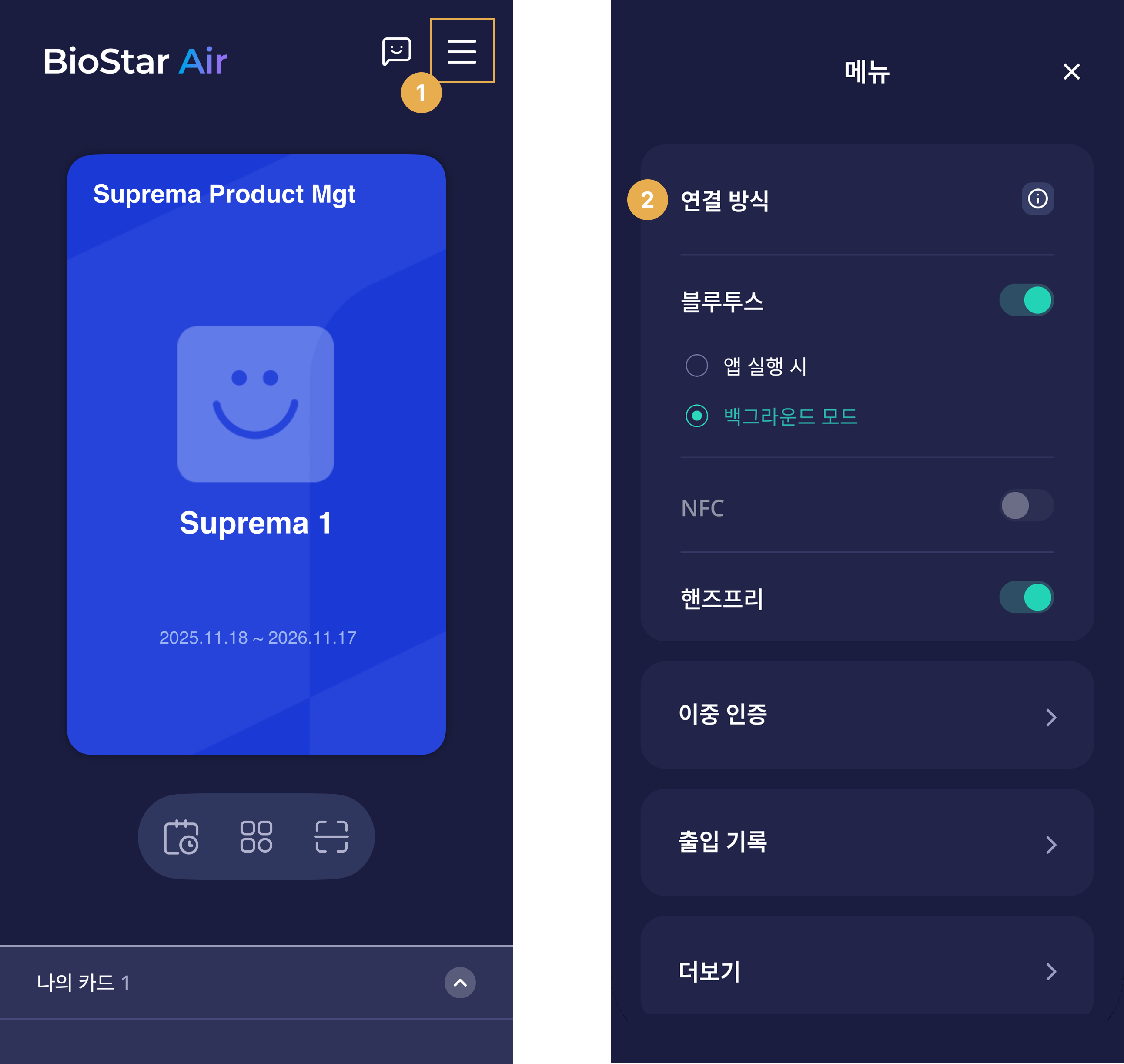 사용자가 출입 통제 장치와 통신하는 데 선호하는 연결 방식을 선택할 수 있습니다. 슈프리마 패스 앱 초기화면에서 오른쪽 상단의 아이콘을 탭한 후 연결 방식에서 원하는 모드를 선택하세요.