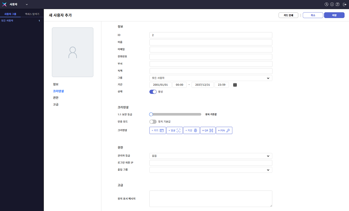 크리덴셜 섹션에서 사용자 크리덴셜을 등록하고 출입 인증 방식을 설정하세요.