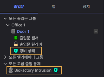 경비 상태의 출입문은 경비 상태 아이콘이 상태에서 상태로 변경됩니다. 이때 해당 출입 통제 설정에도 아이콘이 적용됩니다.