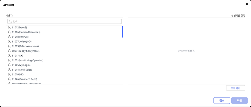 APB 해제 창이 나타나면 안티패스백을 위반한 사용자 목록을 확인하세요.