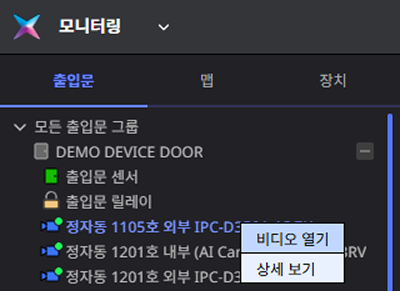 카메라 장치의 영상을 실시간으로 확인하려면, 팝업 메뉴에서 비디오 열기를 클릭하세요. 모니터링 섹션의 비디오 타일에 선택한 카메라의 영상을 추가하고, 재생할 수 있습니다.
