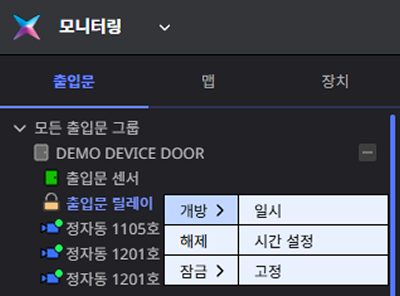 출입문과 연결된 릴레이 장치를 제어할 수 있습니다. 릴레이 장치에서 마우스 오른쪽 버튼을 클릭하세요. 팝업 메뉴에서 원하는 기능을 선택할 수 있습니다.