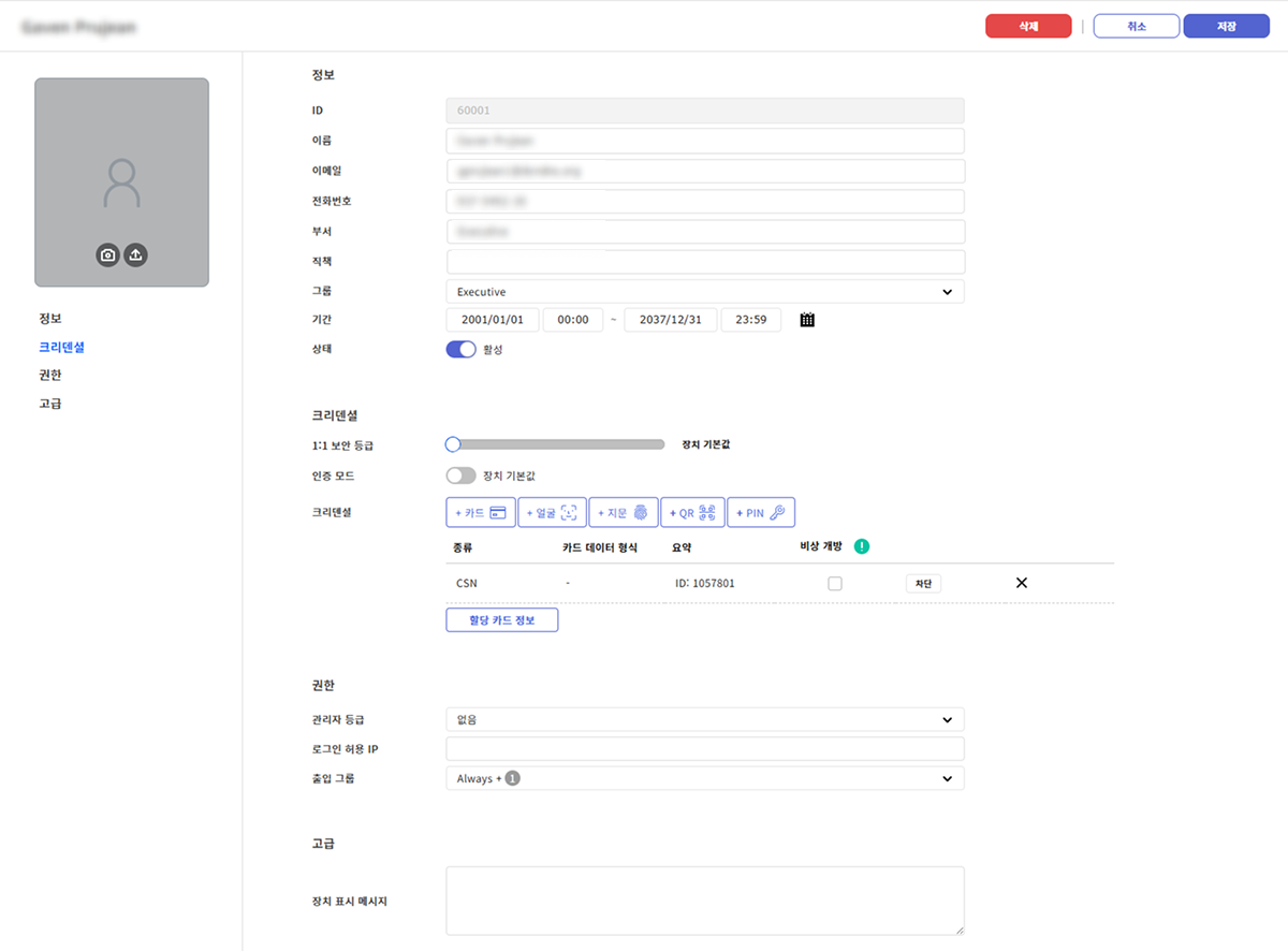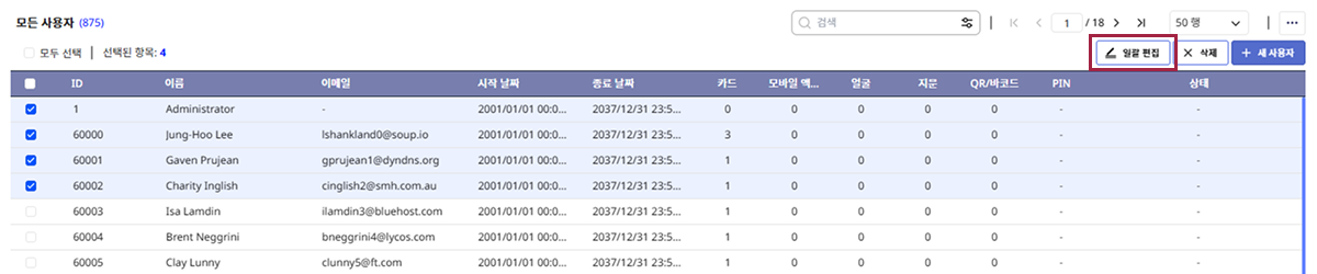 한 번에 여러 사용자의 정보나 출입 권한을 수정할 수 있습니다. 이 기능은 다수의 사용자에게 동일한 출입 권한이나 그룹을 설정할 때 유용합니다.