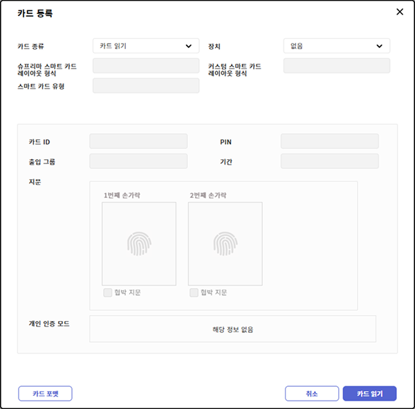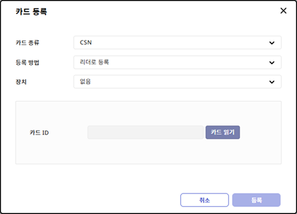 커스텀 스마트 카드: 타사에서 발급한 스마트 카드를 등록할 수 있습니다. 카드 읽기 버튼을 클릭해 카드 ID를 등록하세요.