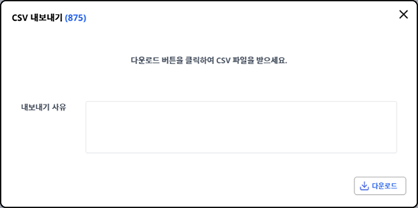 CSV 내보내기 창이 나타나면, 내보내기 사유(선택 사항)를 입력하고 다운로드 버튼을 클릭하세요.