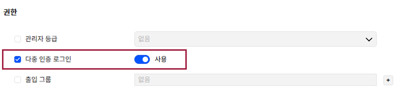 사용자 프리뷰 화면이 나타나면 권한 섹션에서 다중 인증 로그인 항목을 사용으로 설정하세요.