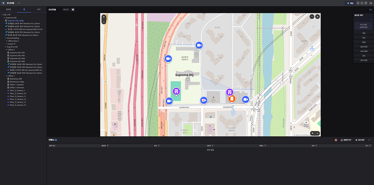 맵 모니터링 기능을 통해 구역과 구역 내 층별 출입문, 카메라 현황을 실시간으로 확인하고, 제어하는 방법을 안내합니다. 맵 모니터링은 구글 지도와 연동된 시각적 인터페이스를 통해 구역(Area)과 층(Floor)을 손쉽게 탐색하며, 출입문 제어, 카메라 영상 재생 등 다양한 기능을 활용할 수 있습니다.