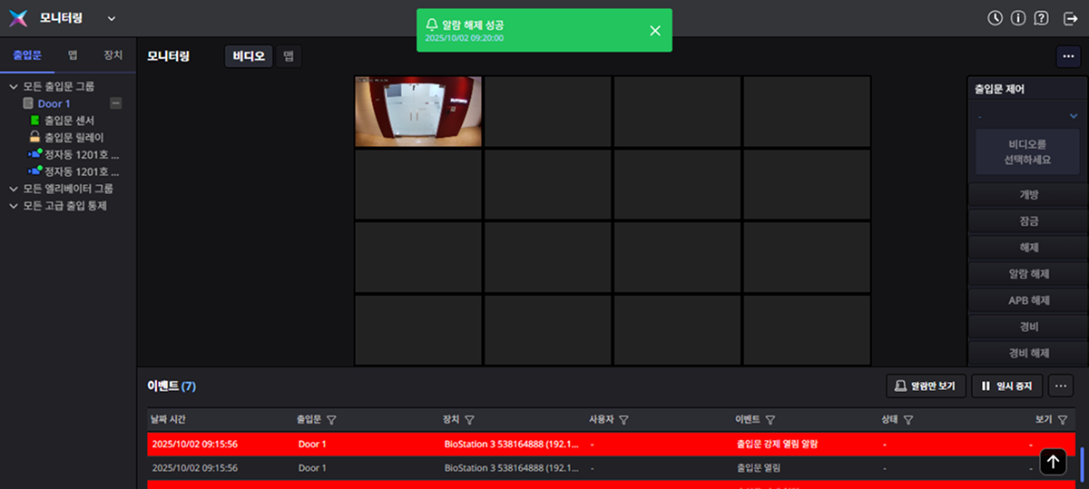 출입문의 알람을 해제하려면 출입문 목록에서 오른쪽 마우스 버튼을 클릭하고, 팝업 메뉴에서 알람 해제를 클릭하세요. 또는 출입문 제어 도구에서 알람 해제를 클릭하세요.