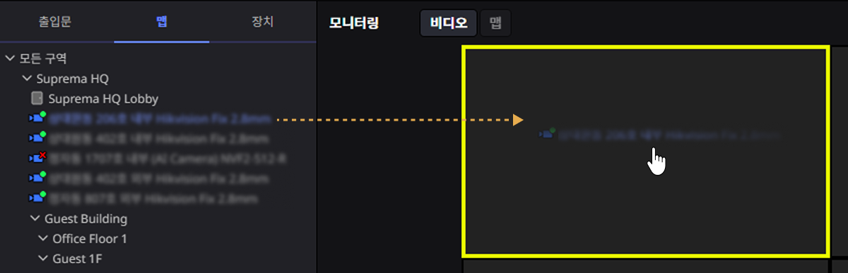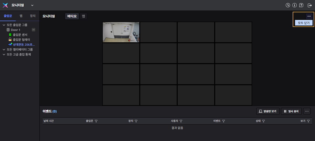 화면 왼쪽 사이드바에서 출입문 또는 맵, 장치 탭에서 영상을 확인할 카메라 장치를 선택하세요.