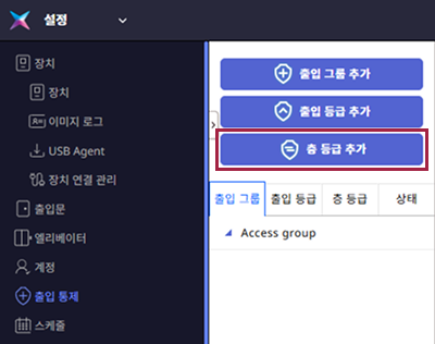 설정한 엘리베이터와 층 정보를 이용해 층 등급을 설정하는 방법을 안내합니다. 층 등급은 출입 그룹에 적용할 수 있는 중요한 요소입니다. 층 등급을 설정하면 사용자가 엘리베이터를 이용해 출입할 수 있는 층을 관리할 수 있습니다.