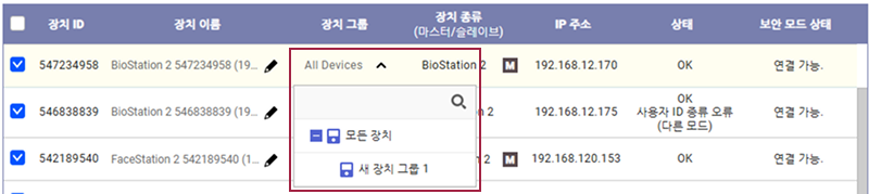 검색 버튼을 클릭하면 입력한 조건과 일치하는 장치가 목록에 표시됩니다.