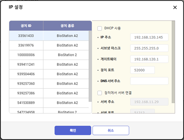 IP 주소를 사용할 수 없거나 변경이 필요한 장치는 IP 설정 버튼을 클릭해 변경할 수 있습니다. 자세한 내용은 다음 문서를 참고하세요.