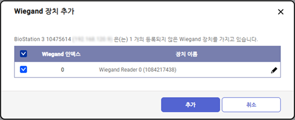 해당 마스터 장치에 연결된 Wiegand 장치 목록이 나타나면 등록할 장치를 선택하세요.