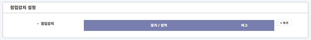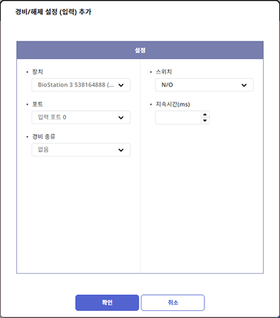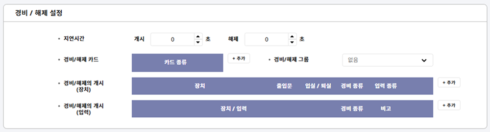 경비/해제의 개시: 장치에 의한 경비 시작/해제 또는 입력 신호에 의한 경비 시작/해제를 설정할 수 있습니다. + 추가 버튼을 클릭하고 각 항목을 설정하세요.