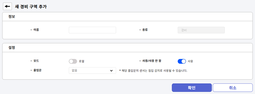 경비 구역: 경비 개시 후 허가받지 않은 사람이 침입을 시도하면 경고음을 출력하거나 릴레이 신호를 출력하도록 설정한 구역입니다. 주로 업무 종료 이후 경비를 개시하며, 경비 개시 이후 출입을 시도하면 설정된 알람이나 신호를 출력합니다.