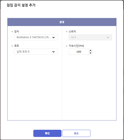침입 감지 신호를 설정할 수 있습니다. + 추가 버튼을 클릭하고 아래와 같이 설정하면 BioStation 3 장치의 0번 입력 포트에 연결된 N/O 센서가 100(ms) 동안 신호를 보낸 경우 침입을 감지한 것으로 인식합니다.