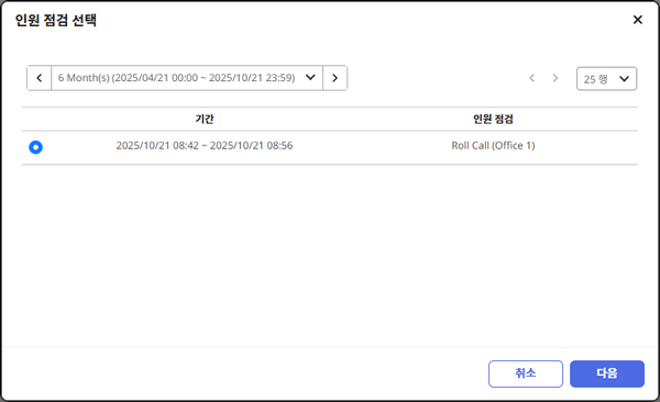 인원 점검 선택 창이 나타나면 보고서로 확인할 인원 점검 항목을 선택한 후 다음 버튼을 클릭하세요.