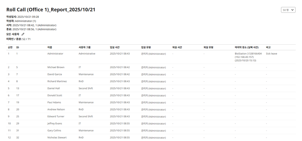인원 점검을 완료한 후 데이터 → 리포트 생성 → 인원 점검에서 관련 보고서를 확인할 수 있습니다. 자세한 내용은 다음 문서를 참고하세요.